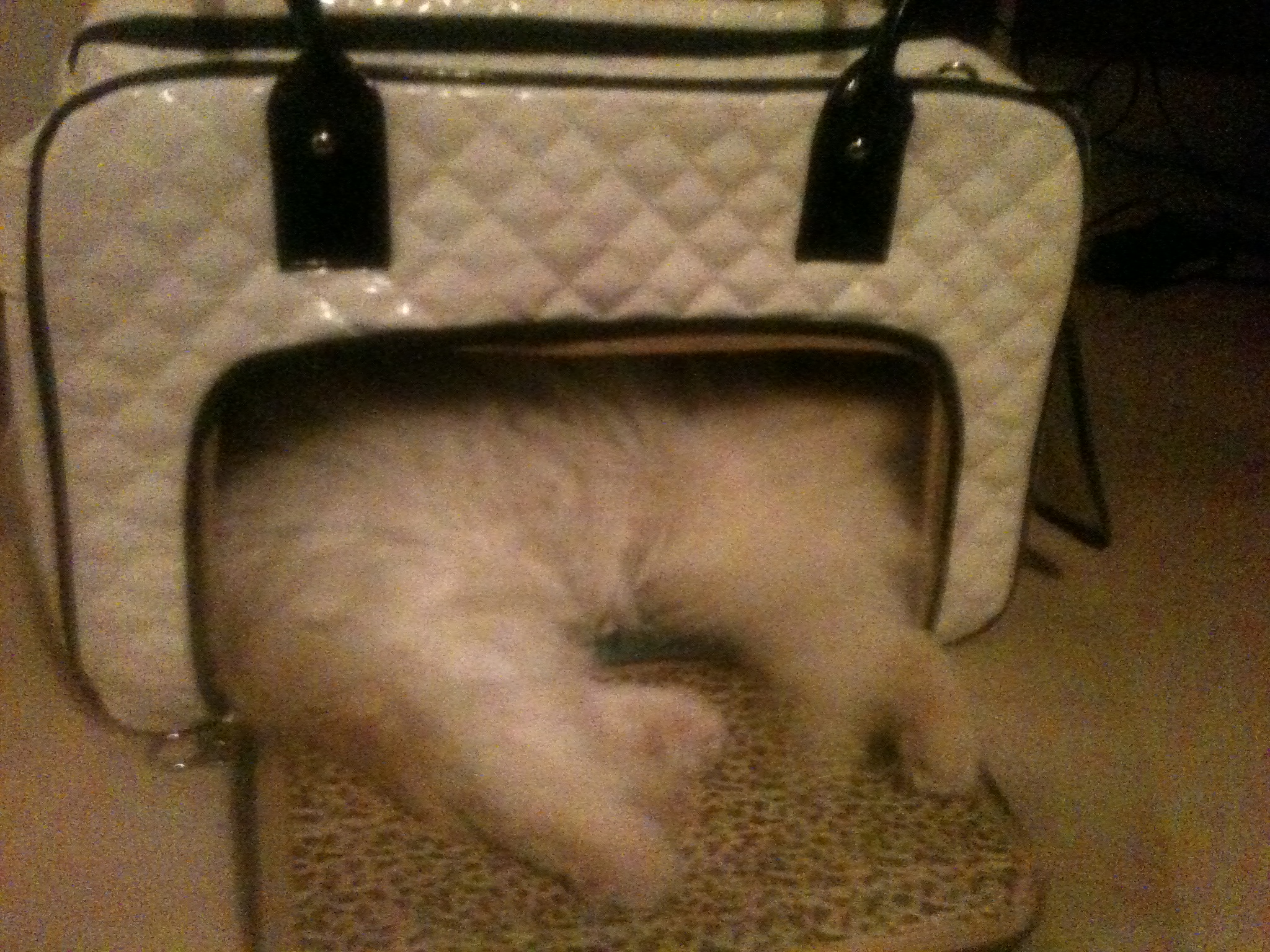 At breakfast today, there was an elderly couple at another table. When they went to pay the bill, I saw them look first at mom, then at dad, then at me, then at my cute little white “Chanel” style travel bag, and then again at me cauze mom was holding me in her arms sipping her gourmet coffee. They obviously have never seen an Asian type kitten with a flat doll face and a flat nose!